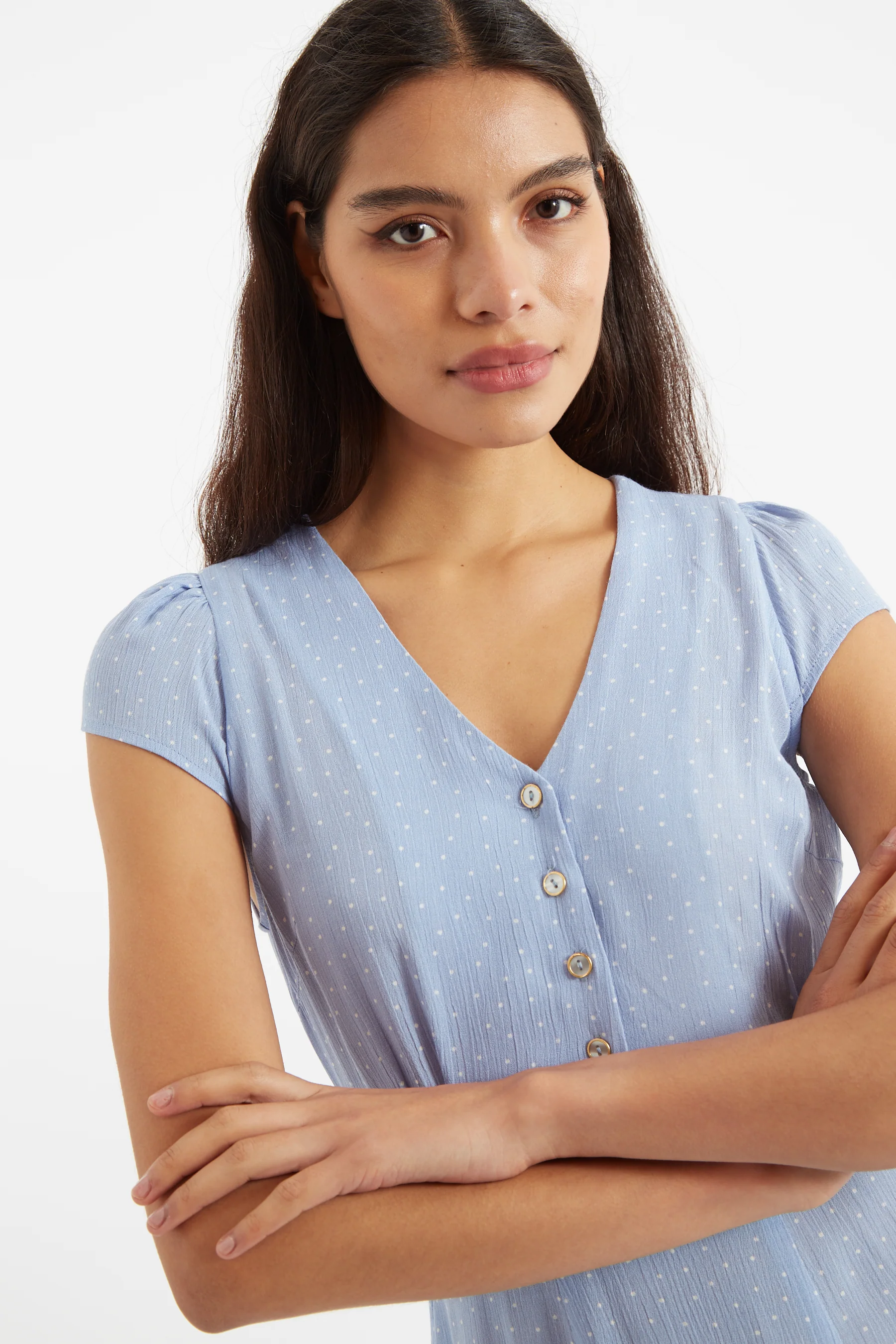 Inspired by a vintage tea dress our favourite Cathleen dress will serve you well for seasons to come. This shape is simply the most flattering shape ever. Crafted in a pale blue crepe printed with tiniest dot. Featuring cap sleeves, a fitted bodice with gold-edged buttons, a back tie waist to customise your fit and of course those deep side seam pockets which we all truly love. Style with sandals or trainers and let her be your forever dress.