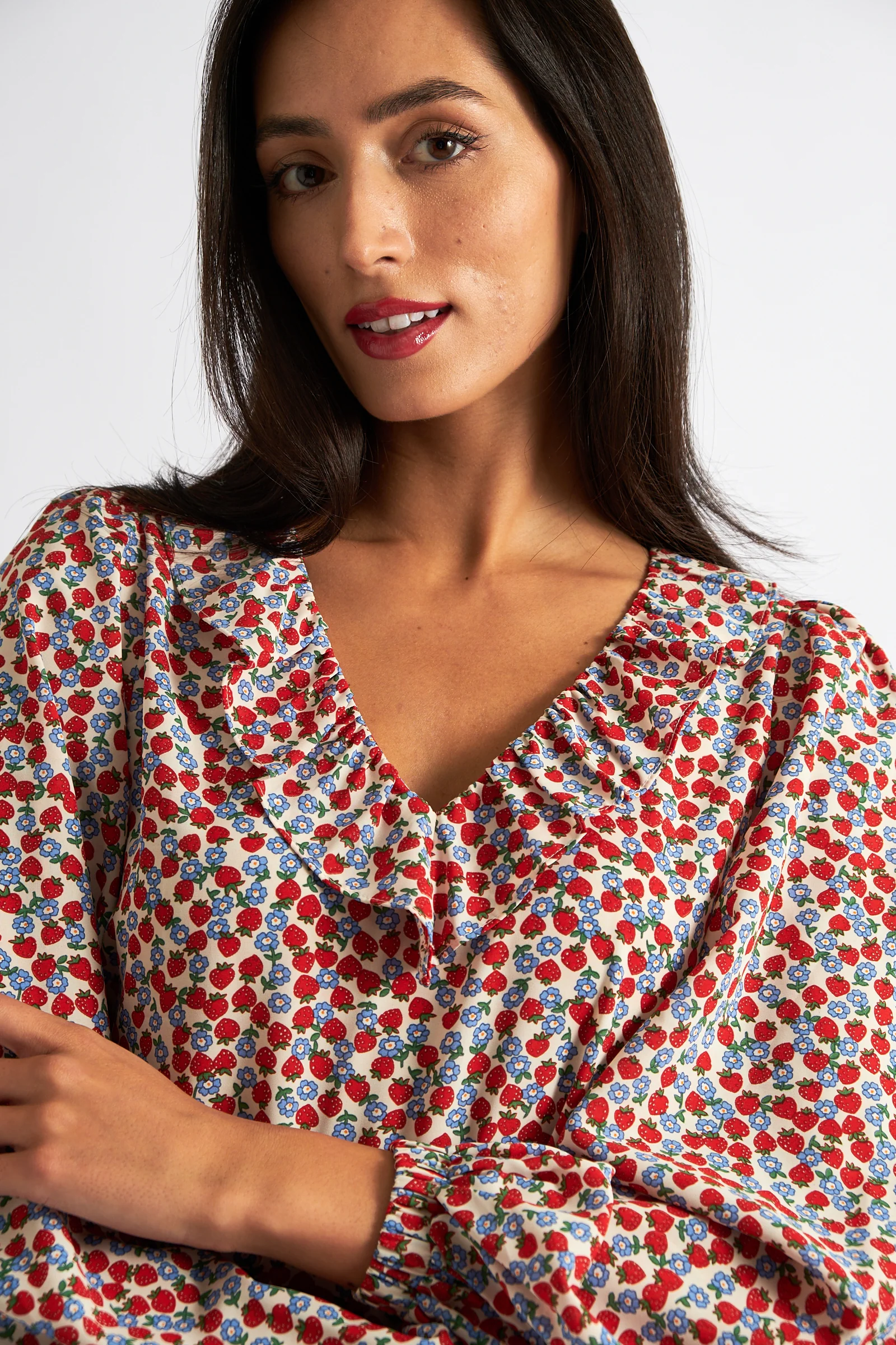 "Take a trip to a whimsical strawberry field with our Kyara Blouse. This boho-inspired top features a frill-edged V-neckline and voluminous sleeves with an elasticated cuff. Crafted in a playful strawberry print, it's the perfect addition to your relaxed and stylish wardrobe"