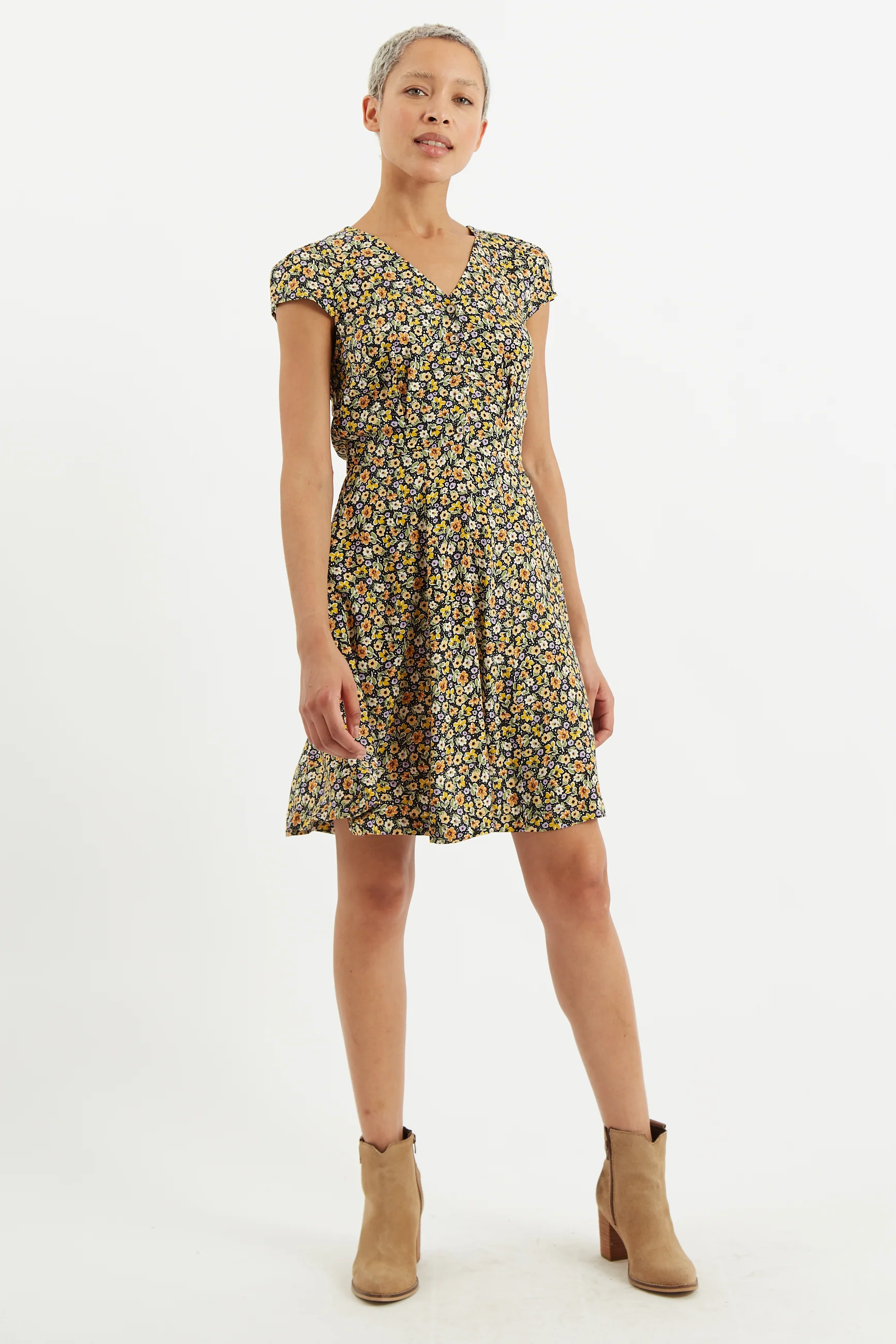 Inspired by a vintage tea dress, we have added a western touch to our favourite Cathleen dress. Crafted in a ditsy floral print, this style is simply the most flattering shape ever. Featuring cap sleeves, a fitted bodice with gold edged buttons, back tie waist to customise your fit and of course those deep side seam pockets we all truly love. Style with cowboy boots, trainers or sandals and let her be your forever dress.