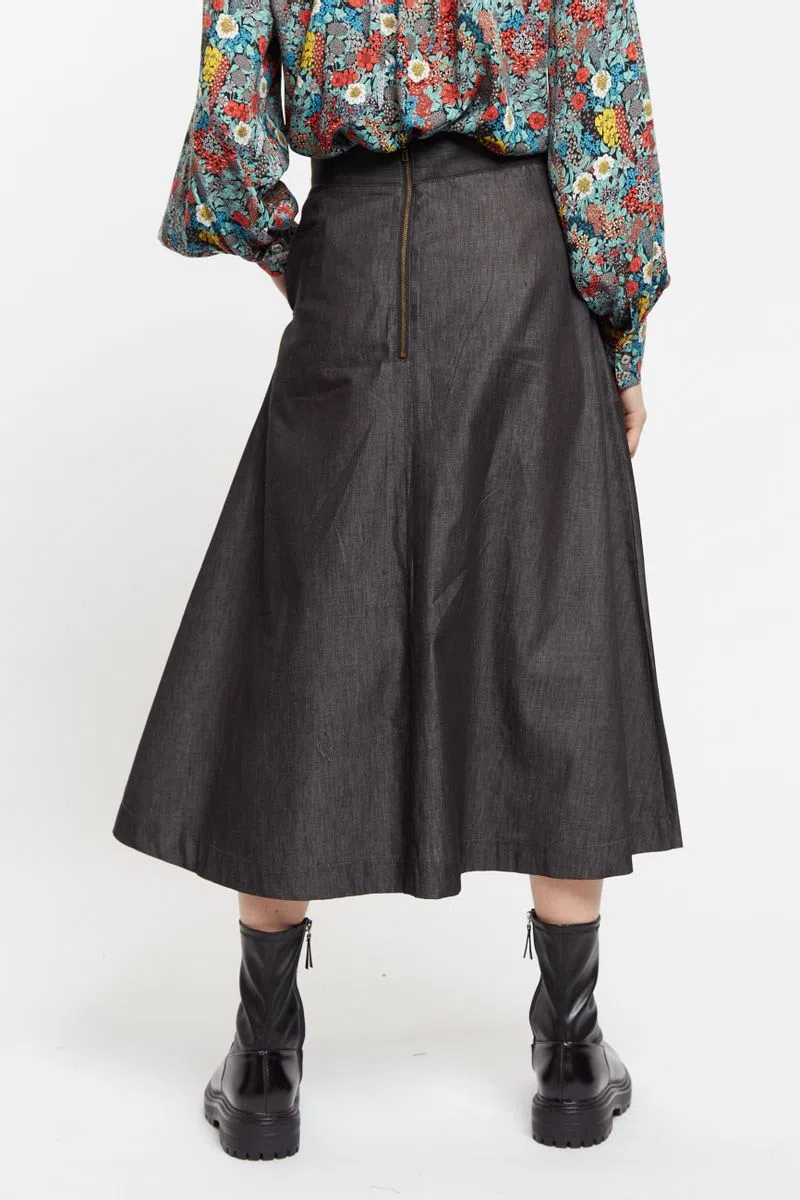 Crafted in a dark black chambray this midi skirt with deep pockets and a front split has to become your wardrobe go to, easy to coordinate with almost everything in your wardrobe. We like it worn with our Jan Peace sweat.