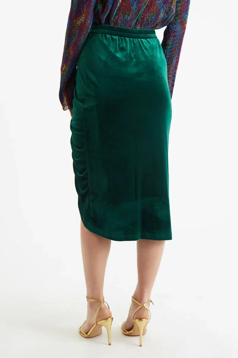 Crafted in a luxurious soft velvet this ruched skirt mixes high octave sass with practicality. A perfect wardrobe staple to elevate a simple black or coloured top to next level. Also available in Black.