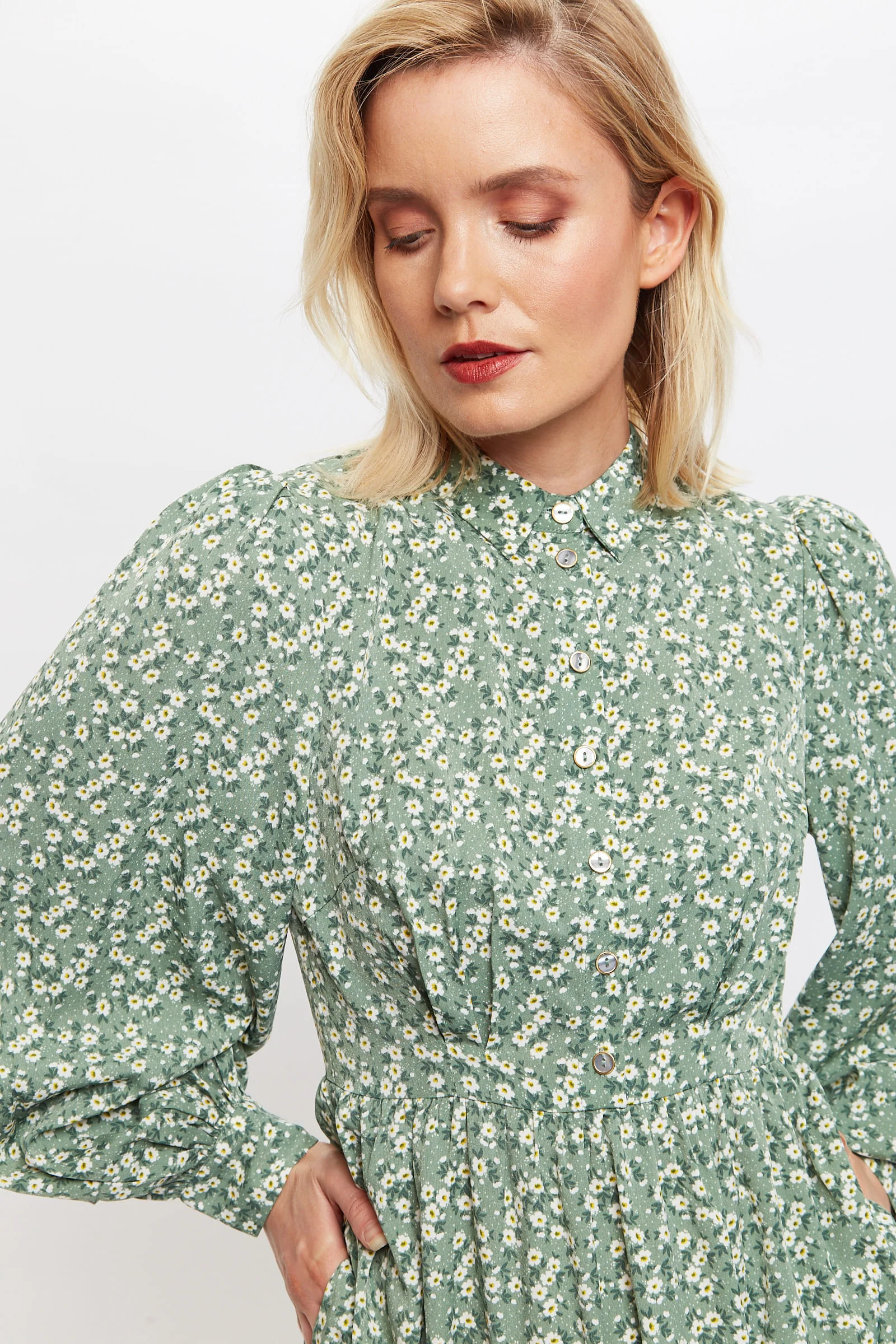 Meet Nathalia our easy-fitting throw on, tiered, midi shirtdress. Crafted in our beautifully delicate double daisy print. Featuring an elasticated back waist to give definition but maintain comfort, full sleeves and our trademark deep side seam pockets. An incredibly versatile style that is simply seasonless.