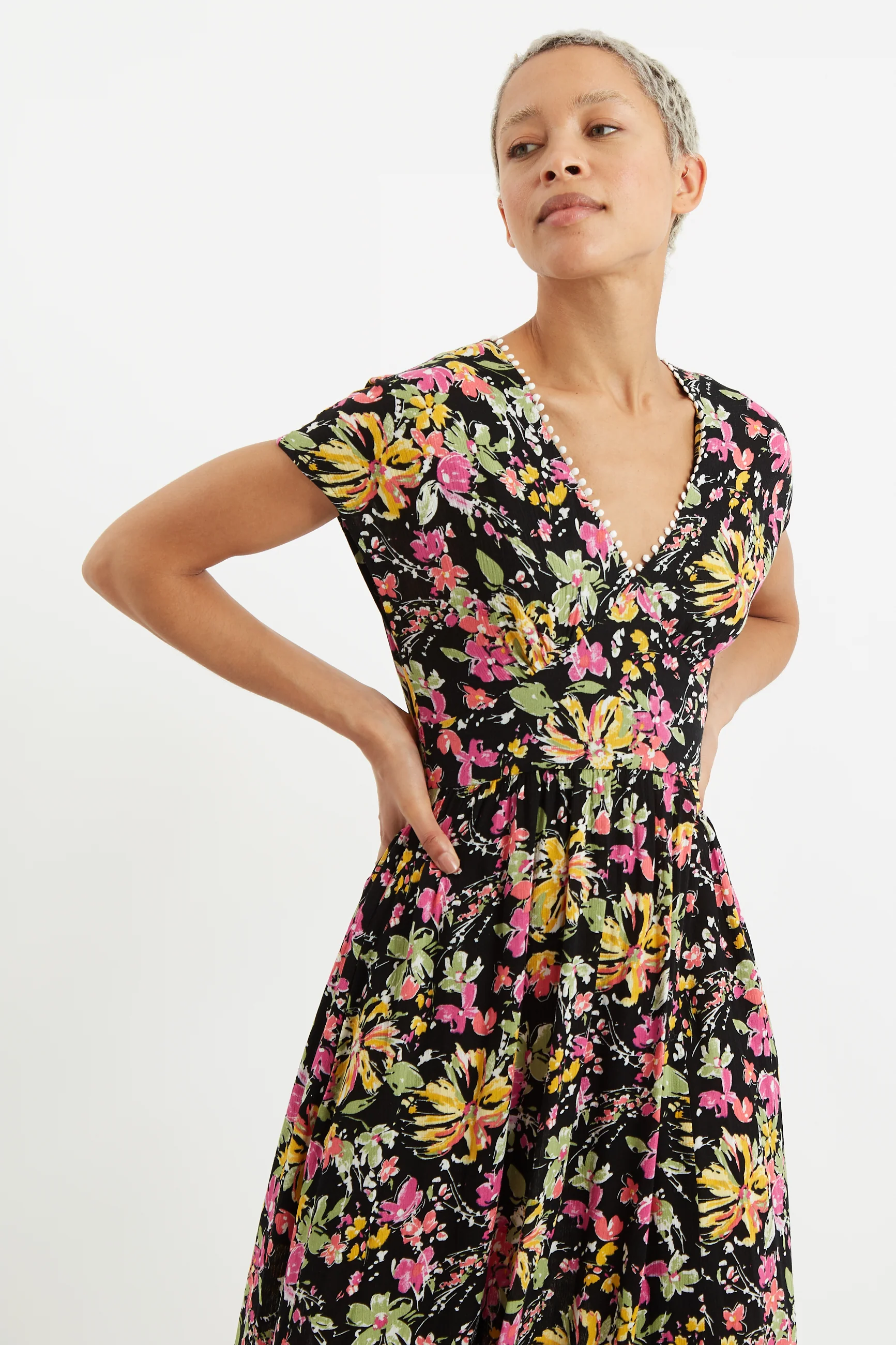 Unity is one of your favourite styles this season we have made it in a wow bright summer floral on a black ground trimmed with small bobble trim. Featuring a flattering V neckline, an elastic back waist for definition a side front split and side pockets. Unity looks good dressed up or down, making it that go to dress for any occasion.
